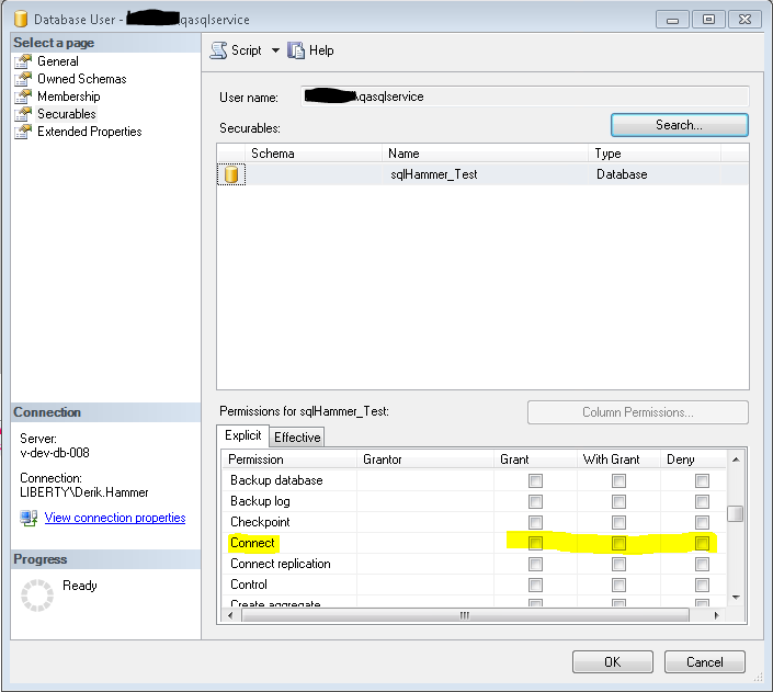 As you can see the user in question here is DOMAIN\qasqlservice. The down arrow to me says, “disabled,” but technically there is not a disabled setting for the user. Rather, in this case the CONNECT permission was not granted.