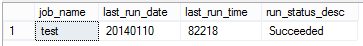This next query will return the last execution and status for a given job, or all jobs if you comment out the WHERE clause. This can be used to monitor how long it’s been since a job last succeeded.