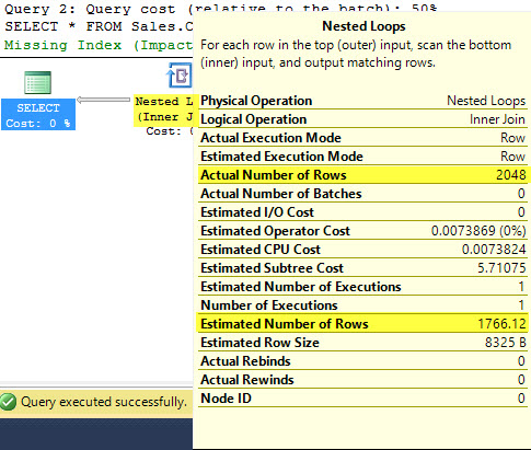 In this first execution plan we see that the optimizer chose a Nested Loop operator because there were only 1766 rows estimated.