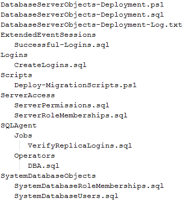 You can see, above, that I am calling a T-SQL file named DatabaseServerObjects-Deployment.sql. This is where all of the real work happens. I like to use the SQLCMD r: command to call smaller, more manageable scripts rather than one large script. I’d start with this directory structure.