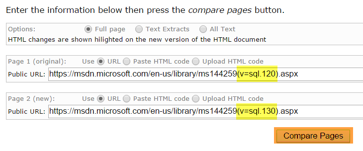 Once you have navigated to the webpage, simply fill in the URLs for the two versions and click compare pages. Be sure to pay attention to which URL you are putting into the original text box and which goes in the new text box.