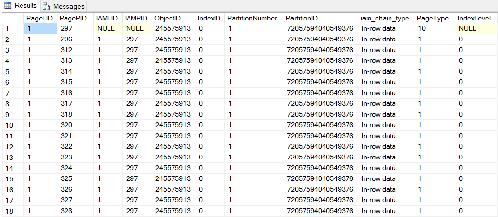 With DBCC IND, we have 17 data pages and 1 IAM page. IAM pages are not self-referencing, therefore the IAMFID (IAM file Id) and IAMPID (IAM page Id) are NULL. This means that our IAM page is in file Id (PageFID) 1 and is page Id (PagePID) 297. DBCC PAGE will allow us to view our IAM page.